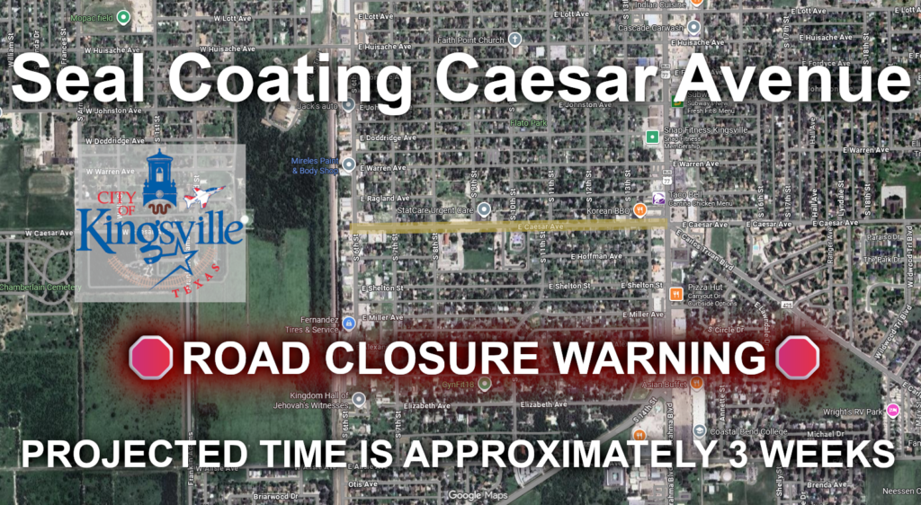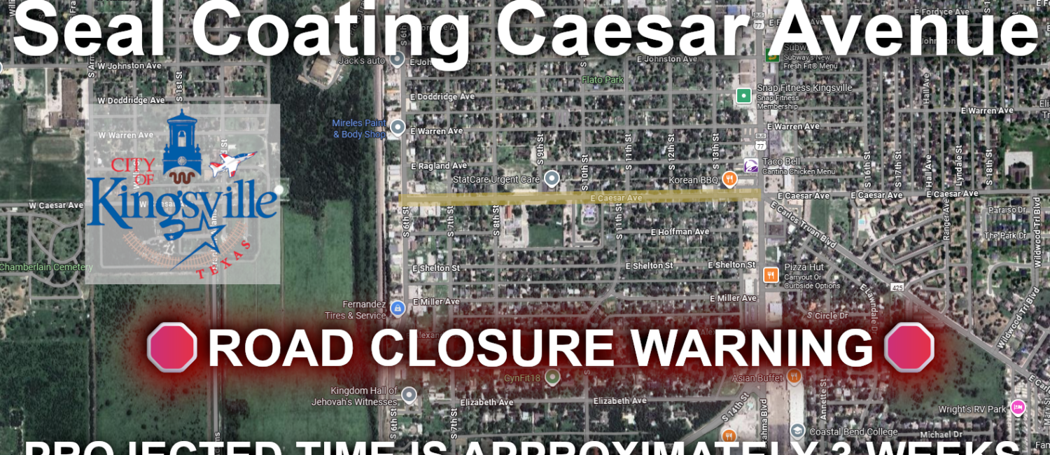 The City of Kingsville Street Dept has begun Seal Coating East Caesar Avenue between South 6th Street and South 14th Street, starting Monday morning, October 6th, 2025. Barring inclement weather or equipment breakdown, this project will take approximately 3 weeks. Sections of E Caesar Ave between S 6th St and S 14th St will be closed during the day, while seal coating is taking place. Signs and barricades will be in place.